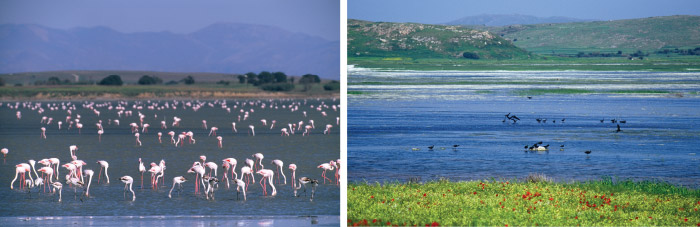 According to European directive, most of the north-eastern part of Lemnos is a protected area and has joined the Natura 2000 network. The wetlands of Lemnos cover more than 2% of the total area of the island. The most important is the one consisting of the cluster of lakes Chortarolimni-Asprolimni-Aliki, with a total area of 18,000 acres. The avifauna of the region includes a multitude of migratory and endemic species such as flamingos, herons, grouses, lesser kestrels, ruddy shelducks, swans, falcons, turtle doves, hoopoes, etc. In the rare and protected flora of the area are the sea lilies, poppies, crown daisies, malcomias, 16 species of orchids and many more. Other notable elements of the ecosystem are underwater Posidonia meadows, coastal dunes, a Petrified Forest and an oak tree forest.